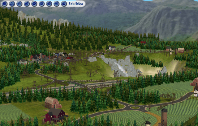 I still need to replace the bridges, and all the other areas of the map with decorative pieces that go with Rural Charm.  I also kind of dread opening the town lots because with the Rural Charm default replacement, the ‘hood sidewalks are gone and the lot roads won’t match the neighborhood roads. I’ll need to add sidewalks that came with the set by hand on every lot or adapt each lot without sidewalks.