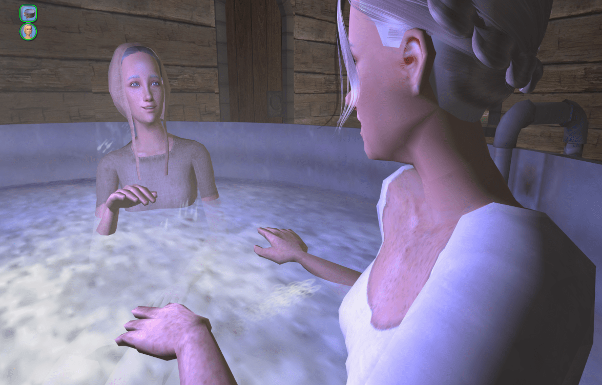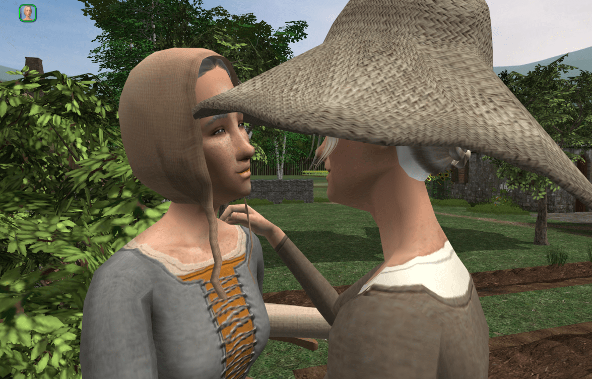 This week I also built the Almshouse in the center of the village.  It is a church-owned property that exists to serve the indigent.  By the rules of the MCC, anyone can come to the Almhouse if they need to be warmed, fed, rest, or bathe.  It is a residential lot, so if needed, during other families’ rotations, I can switch to playing the Almshouse and summon the sims who need to recuperate.