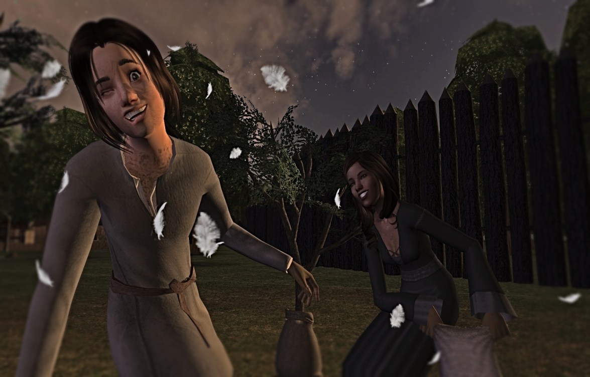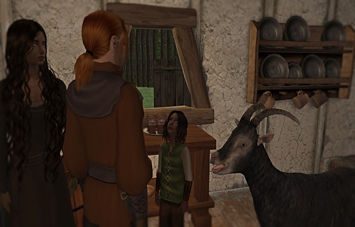 • This post was late, partly due to the holidays, but also because it was just really hard to get into. I think there were several reasons. First, playing big families is daunting, and especially, beginning this challenge with nothing and the pressure of taxes, rent, and tithes. Also, Rhett had stolen (I thought) one goat, which turned out somehow to be two goats, and I didn’t know what to do with them or how to proceed. I decided if anyone came in or saw the goat, they’d be caught, and he would be sentenced to prison and/or a fine (according to the MCC rules). To get rid of the goat, they could not just sell it to the catalog. They’d have to either slaughter the goat, sell the goat to a stranger (which there aren’t in a clean install), or take it into the woods. They slaughtered one and did not pay taxes or report income on it, but their fridge was full and couldn’t hold any more food. The other, as I showed, Gervase took into the woods. I was sure someone would be in the woods when he and Ralf went there, and I made him stay a bit but no one came. The goat wasn’t there when they returned to the woods. Finally, this family was really hard to play because their needs go down so quickly and they love to play! When trying to run their business they would constantly stop and have water balloon fights, or play ball with the customers. However, they ended up doing better with their business than anyone so far. On day three, after Rhett’s aspiration failure (from rejection from Eva), they were all in low aspiration and mood so I spent the whole day just trying to get them out of the dumps.