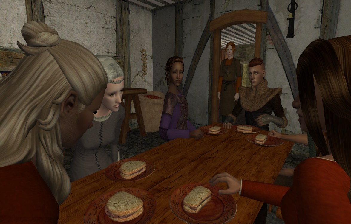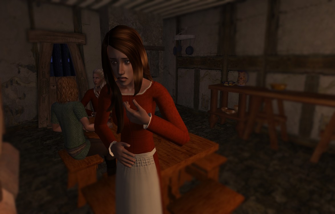 When the meal was ready, everyone sat together at the kitchen table, except for Brodie, the blacksmith. Karin noticed him brooding and wondered about him, but he did not join the meal, and eventually left, without speaking to anyone.