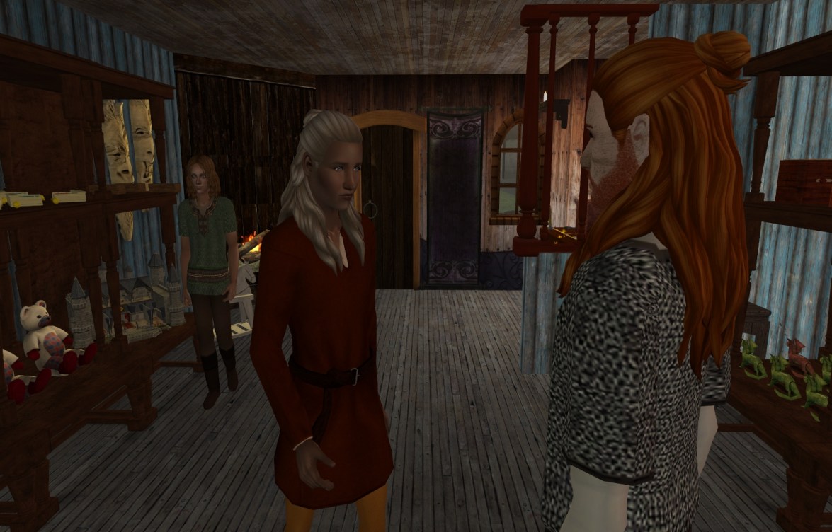 - I lost a day’s worth of pictures (Karin going to matins, and the boys at the shop for two sessions) because I forgot to start up Fraps. But anyway, Oakes came to the store and got a slew of toys. He bought a jack-in-the-box, 3 Sir Bricks-a-Lot, a bear, 2 wooden horses, and a dragon! The dragon is a medieval default replacement for the fire truck. Cindy Sim made the craftable toy replacements.
