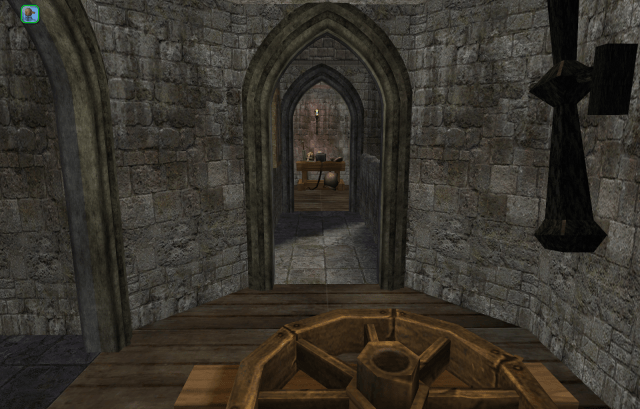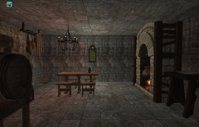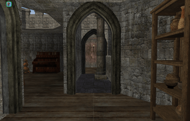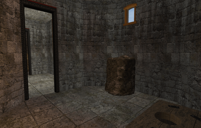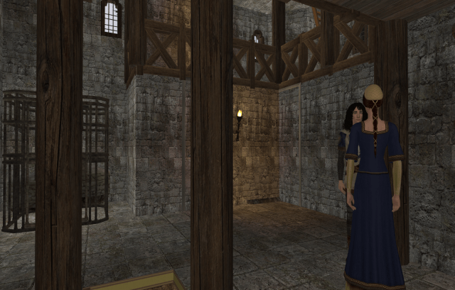 The main room of the barracks level of the Keep. Were a lord living in the Keep, this would be the family’s solar, while the cell block level would be used for dining and receiving. But the Tower is a drafty, cold, miserable place to live. It was built long before chimneys were invented.