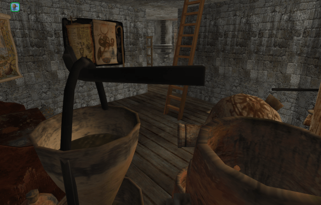 Three floors above ground floor, one climbs through one of the jutting towers from the barracks into the alchemy store room.