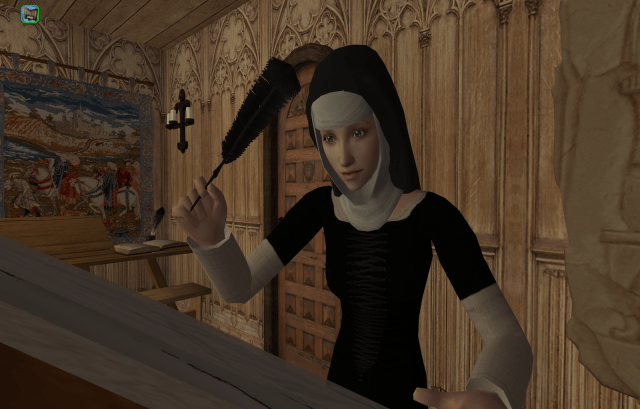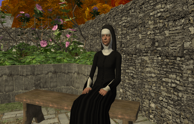 The Abbess, who is not naturally as stern as Sister Alayna, depends on the Prioress for practical matters such as stewardship of the Abbey grounds, lands, and maintaining the standards of the Abbey among the order, pilgrims, and those who visit for their health.