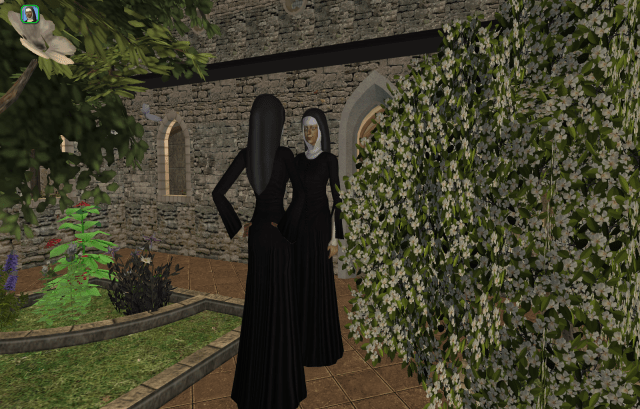 (Left to Right) The Prioress, Sister Alayna, and The Abbess, Sister Noemi, induct the newest sister, Novitiate Joasia Potter, into the order of Saint Lorien. Joasia is the first new sister to join the order since the recent plague and war. During that time, the Prioress, Abbess, and sister Emmaline took sanctuary at the Abbey, but kept completely closed off to the outer world.