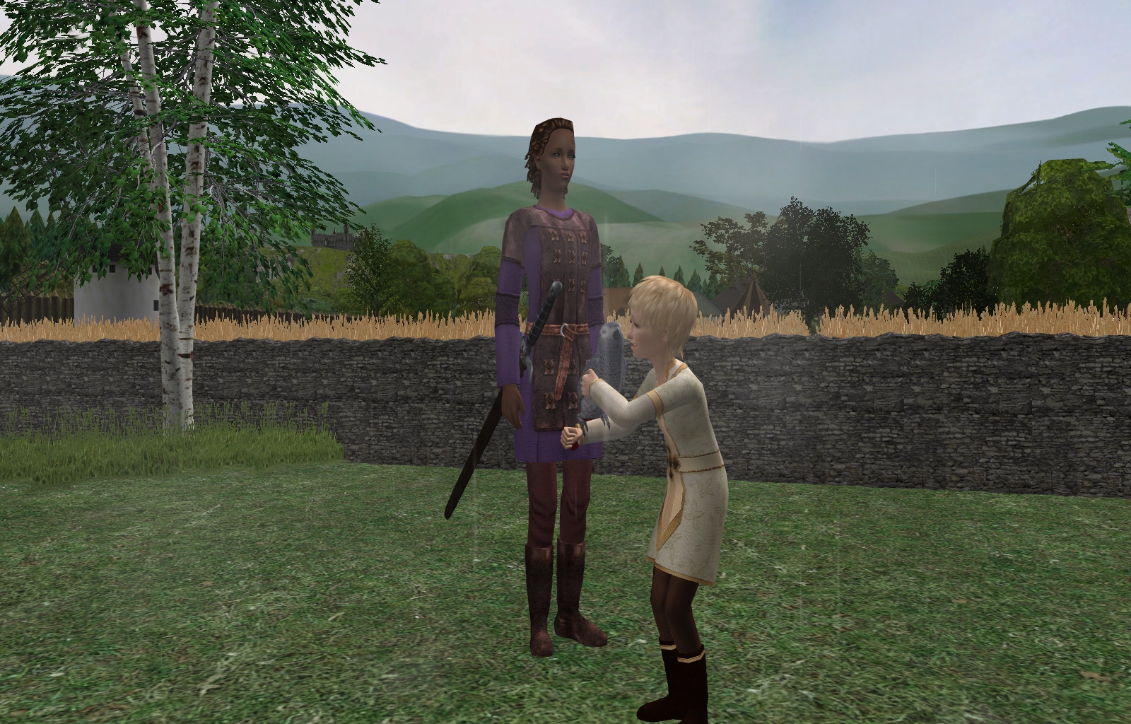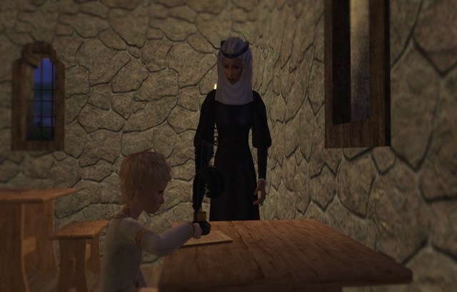 -Lady Rosalind was not abducted by the fairies, but she spent the night looking through the telescope on the highest tower. (The dragon holding a crystal ball is one of Fractured Moonlight’s Hidden Telescope recolors). I decided that I do want Rosalind to have a fairy child. I am also still considering have some kind of magic allow her to have a child with her partner, Lady Jane. I really want a character who has their genetics.