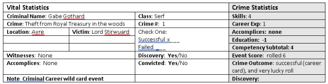 Gabe’s career wild card event resulted in a net $800 from theft.  According to the Warwickshire, the Event Score for Class I theft of property (valued from $50 to $1000) is 25-50, for stealing from nobility (armed vehicle).  The event score range was lowered to  2-50 because of three (theoretical) modifiers that made it “easier.”  The three modifiers were 1) guard asleep -5            , 2) Time, 11 P – 5A, -3, and 3) Open approach on 3 sides, -15 for a total reduction of event score threshold to of -23 yield an event score range of 2-50.  I rolled a 6, so Gabe was successful, which is what his career card said too.
