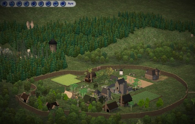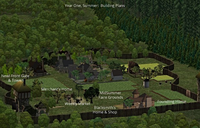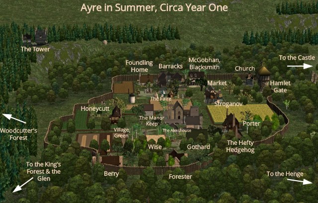 First planning layout for AyreFirst Screen Capture on the GroundAyre in Testing: The Berry hovel from the future site of the village greenAyre after addition of the peasant hovels, Manor Keep, Almshouse, first two Yeoman homes, Barracks, & Hefty HedgehogBeginning of Summer, Year OneEarly in Summer, Year One.One of the first screen captures of the ValeThe Vale with the addition of the Monk’s Inn & Innkeeper’s houseAyre in Year One, Summer, after addition of the Merchant’s QuarterThe Vale, Year One, (late) Summer. The Weaver lands & Mill planned and the Fisher hut added.